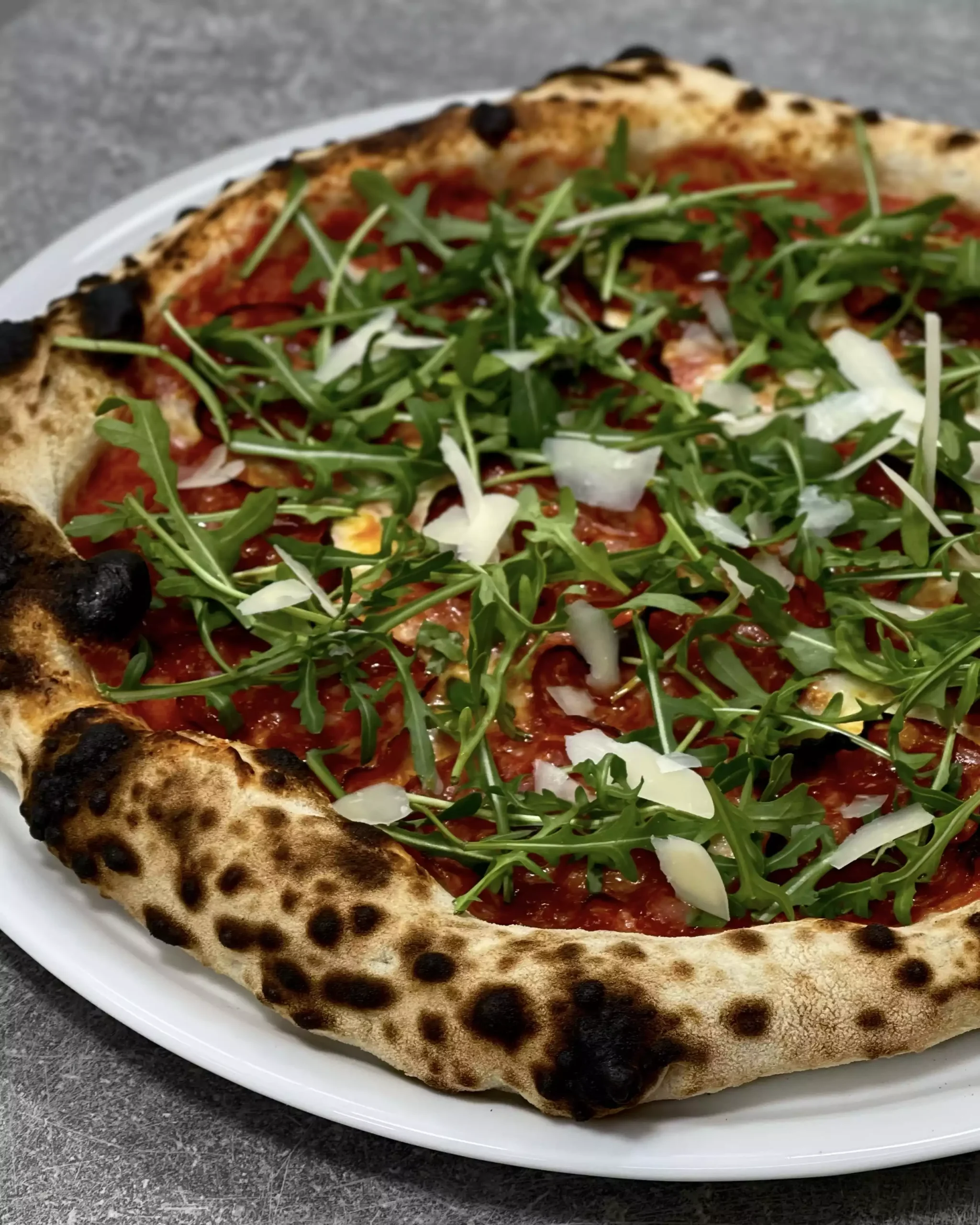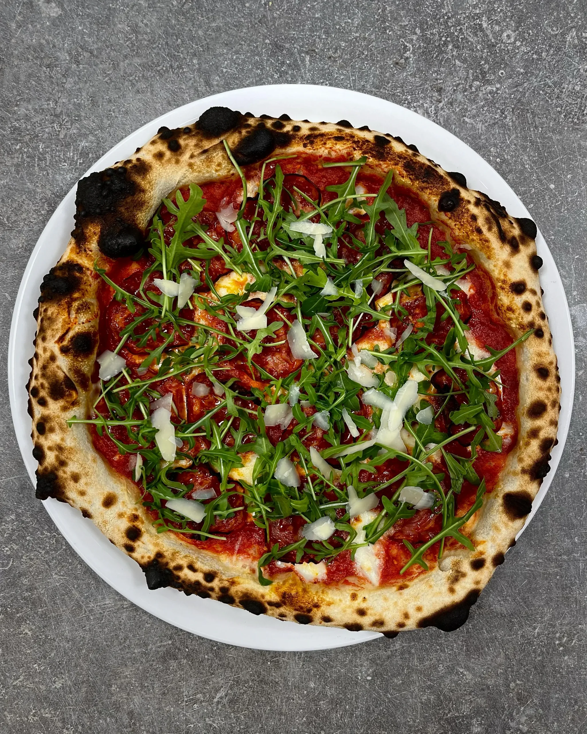 Sauce tomate, mozzarella fior di latte, jambon cru Italien, roquette, grana padano DOP