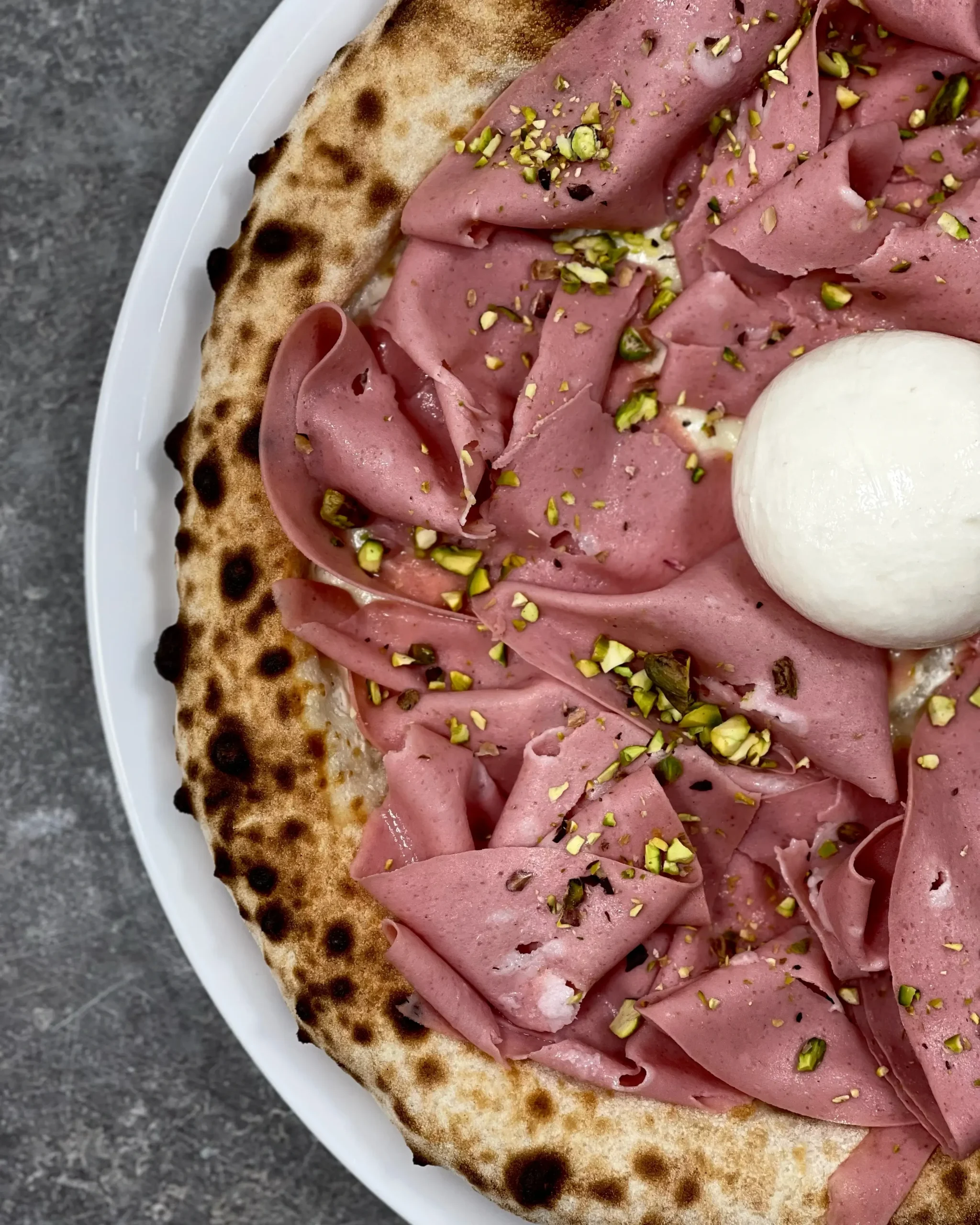 Crème fraiche, mozzarella fior di latte, mortadelle, burrata, éclats de pistaches, feuilles de basilic
