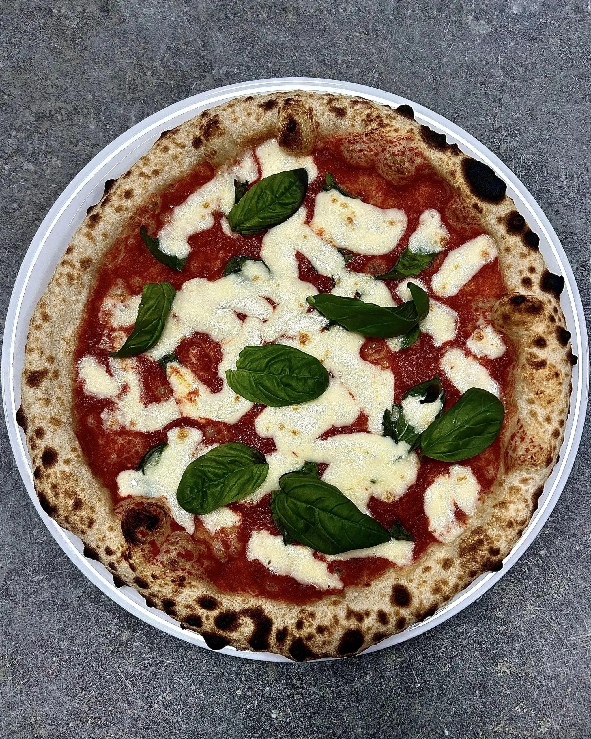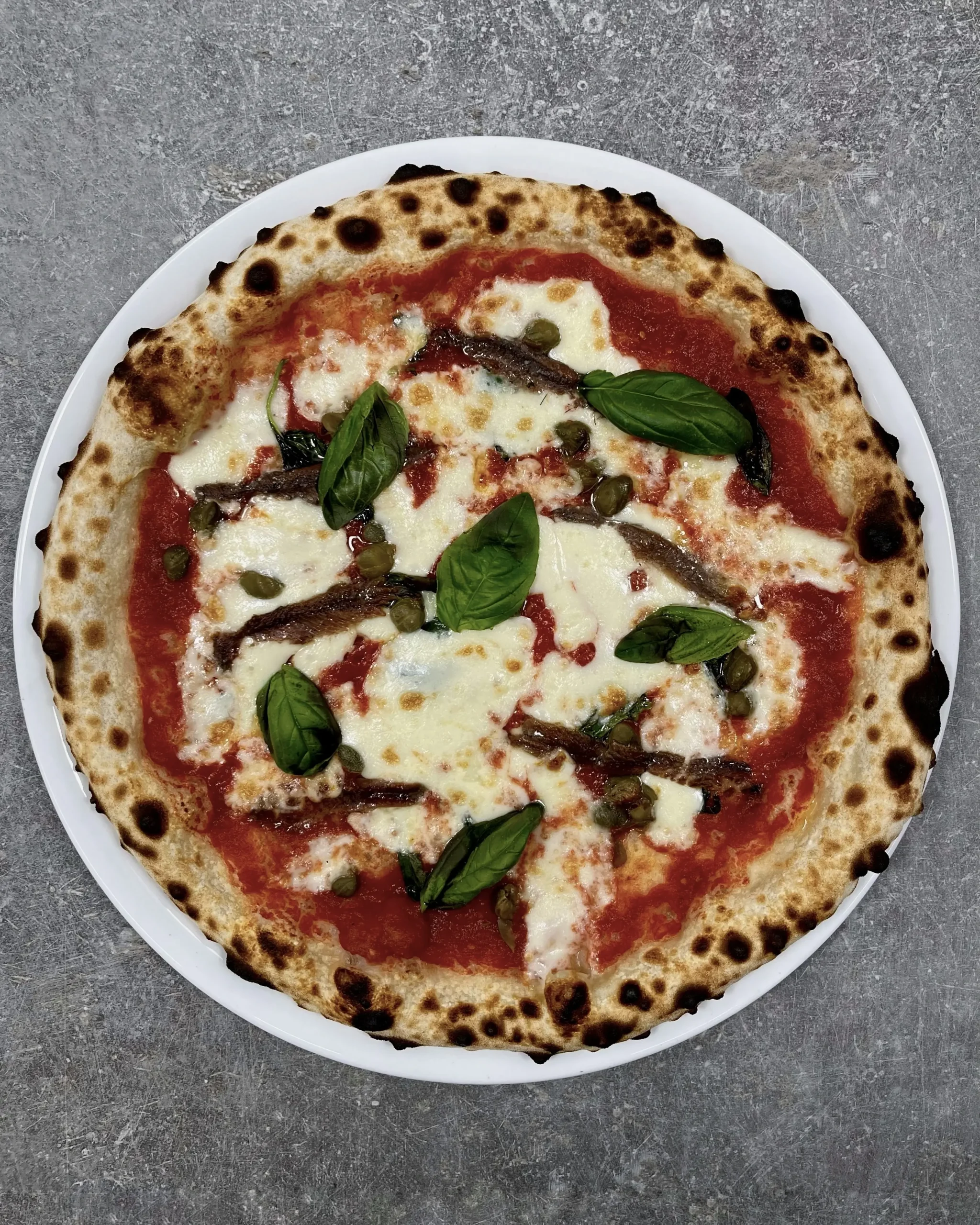 Sauce tomate, mozzarela fior di latte, câpres, anchois, feuilles de basilic