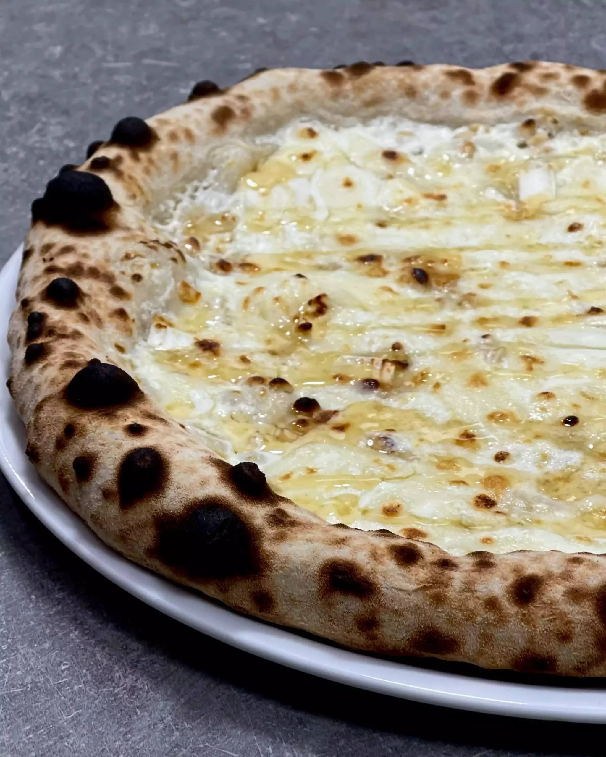 Crème fraiche, mozzarella fior di latte, oignons caramélisés, guanciale, pommes de terre, taleggio DOP, poivre noir